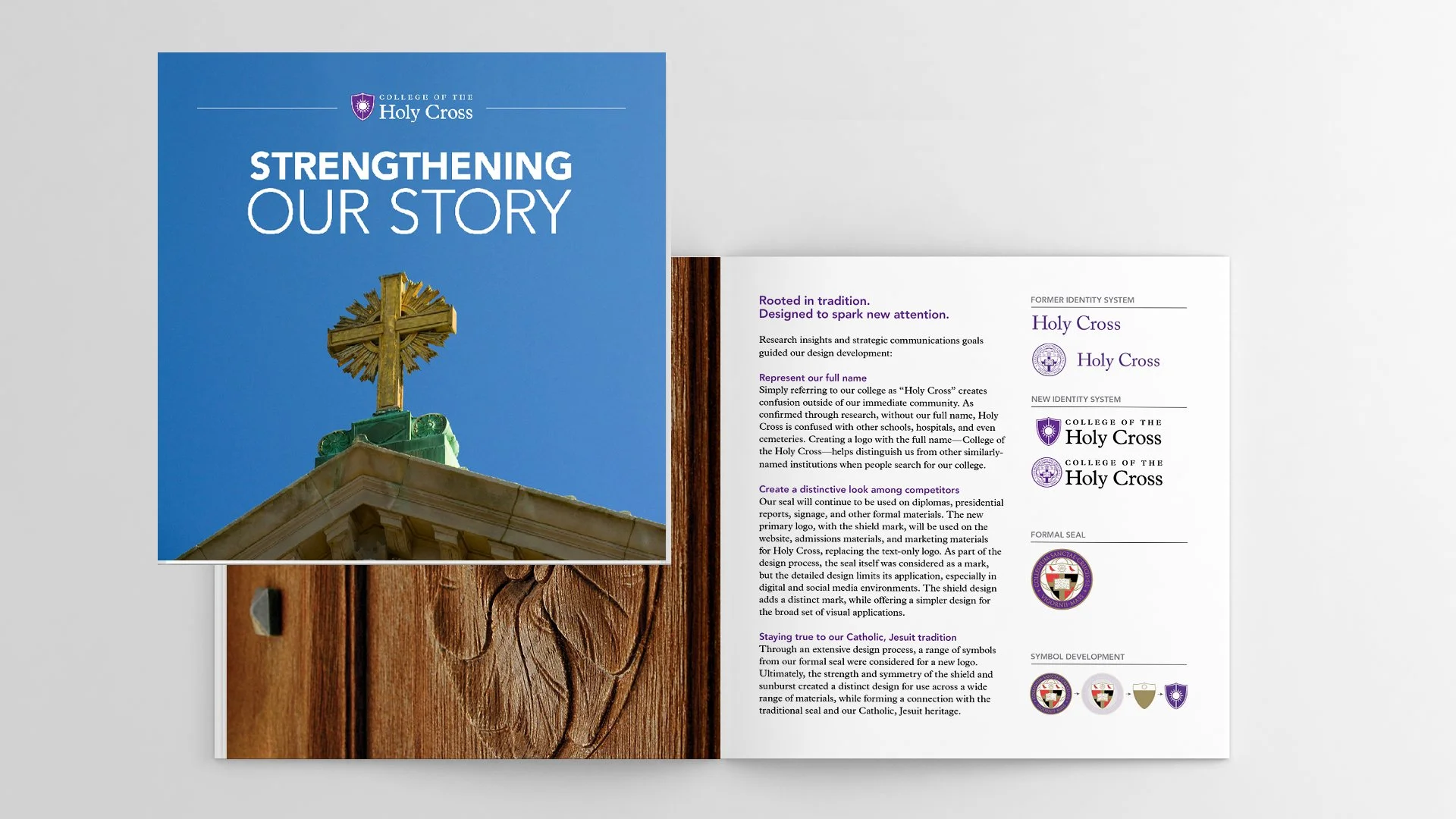 The College of the Holy Cross was founded in 1843 by the Society of Jesus (Jesuits) in Worcester, Massachusetts. To raise their national profile and attract new students, I worked with the client to develop two guiding objectives: to differentiate Holy Cross (as it was known) from many other institutions with similar names (high schools, hospitals, cemeteries), and to strengthen and unify communications across campus.